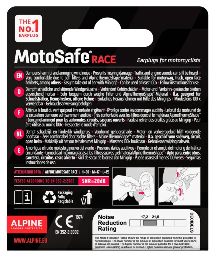 Podczas jazdy na motocyklu, priorytetem jest dobra zabawa. Niestety, po długiej trasie wielu motocyklistów doskwiera irytujące dzwonienie w uszach i uczucie wyczerpania. To wynik wysokiego poziomu hałasu generowanego przez wiatr podczas jazdy. Firma Alpine stworzyła specjalne zatyczki do uszu z filtrem dla motocyklistów. Alpine MotoSafe Race MotoGP™ pozwala cieszyć się najbardziej ekscytującą przejażdżką życia.