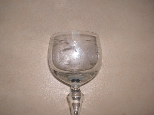 Kieliszki kanelowane szklane do wina na nóżce. Szkło kieliszków bezbarwne. Wysokość 18 cm, średnica wlewu 6,5 cm, średnica stopy 7 cm, wysokość czaszy 6 cm, średnica brzuśćca czaszy 7 cm. Szlif kanelowania w rycie ornamentu grona winogron dużych kiści.Rzecz używana bez śladów użytkowania. Na komplet składa się 5 sztuk.