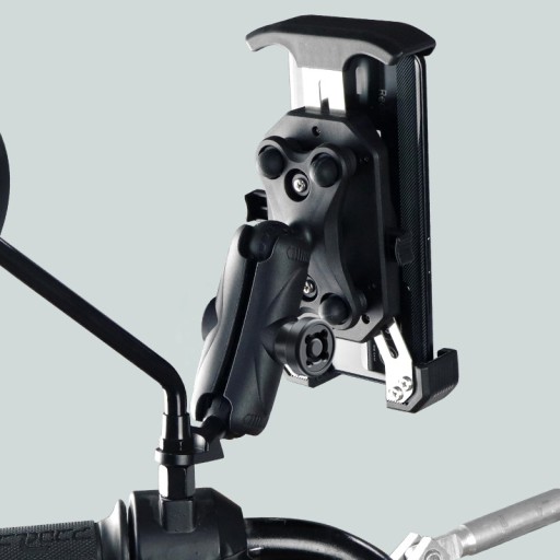 Element montażu do motocykla nie jest bezpośrednio połączony z uchwytem. Zamocowany jest na płycie, która przesuwa się na dwóch płozach oraz łagodzą jej ruch aż 4 niezależne amortyzatory. Jako jedyny uchwyt posiada możliwość zmiany napięcia amortyzatorów.