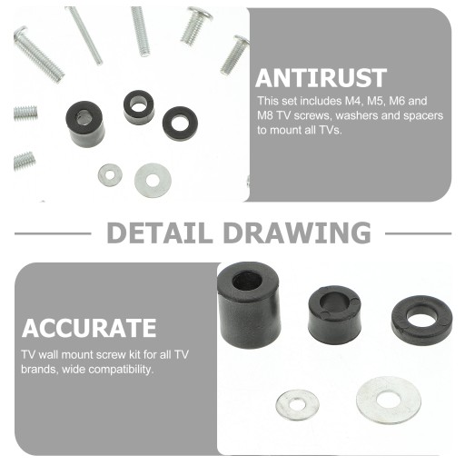 Ten zestaw zawiera śruby TV M5 i M8, podkładki i elementy dystansowe do montażu wszystkich telewizorów.