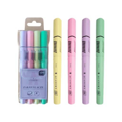 ZAKREŚLACZE PASTELOWE 4 KOLORY INTERDRUK ACADEMY 3mm MARKERY PISAKI Pastelowe zakreślacze w trójkątnym kształcie - doskonałe narzędzie do podkreślania i kolorowania tekstu. Cechy produktu: Piękne, pastelowe zakreślacze w etui ze ściętą końcówką znacznie ułatwiającą użytkowanie. Idealne do podkreślania oraz kolorowaniu tekstu na papierze, kserokopii oraz papierze termicznym (fax). Zakreślacze mają trójkątny kształt. ? Opakowanie zawiera 4 zakreślacze: fioletowy różowy żółty zielony Wymiary opakowania - 17.5 x 6 x 1.5 cm Producent - Interdruk