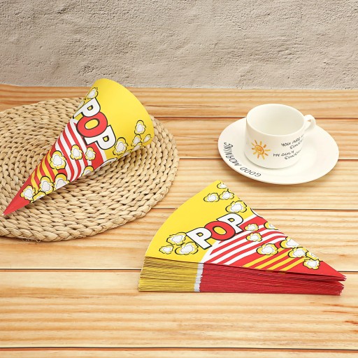 Przedmioty to torby papierowe w kształcie stożka, wykonane z najwyższej jakości papieru, bezpieczne w użyciu. Nadrukowany wzór z motywem popcornu, specjalnie zaprojektowany do użytku z popcornem. Idealny również jako torba do przechowywania cukierków, ciast, chleba, kiełbasy, chipsów ziemniaczanych i innych. Nadaje się do oglądania filmów w domu lub na imprezach, karnawałach, kinach itp.