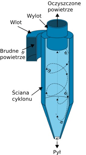Cyklon odpylający (separator) to urządzenie wykorzystywane do oczyszczania gazów z cząstek stałych (pyłu). Działa na zasadzie siły odśrodkowej, która oddziela cięższe cząstki pyłu od powietrza, umożliwiając ich zebranie w pojemniku. Czyste powietrze jest następnie wypuszczane przez centralny kanał.