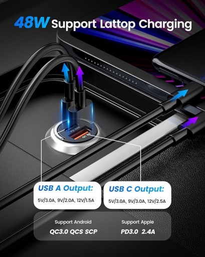 - 【PD30W+ QC3.0】 Podwójna ładowarka USB do zapalniczki samochodowej zawiera porty USB-C i USB-A. Dzięki technologii szybkiego ładowania PD3.0 i QC3.0 moc wyjściowa może osiągnąć do 30 W, gdy używany jest tylko jeden port. Tymczasem ta podwójna ładowarka samochodowa obsługuje ładowanie dwóch urządzeń w tym samym czasie i automatycznie dostosowuje się do każdego portu. Proces ładowania jest do 5 razy szybszy niż w przypadku konwencjonalnego ładowania.