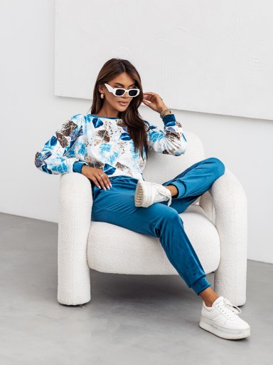 Efektowny komplet spodnie z bluzą o luźnym kroju oversize. Spodnie z wysokim stanem z kieszeniami po bokach. Nogawki, dół bluzy oraz rękawy posiadają ściągacze. W pasie wszyty jest ściągacz z szeroką gumą. Klasyczny fason, mocno rozciągliwy i bardzo wygodny welur świetnie układający się do sylwetki.
