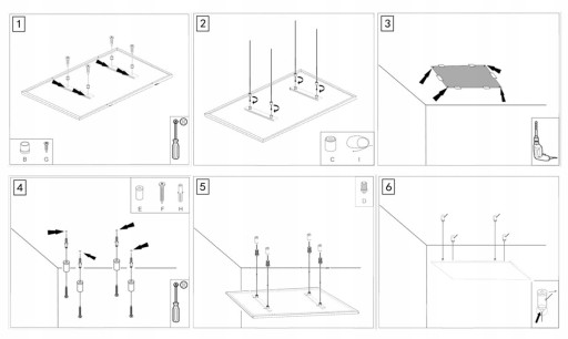 1️⃣ Włóż krótkie śruby G do B i wkręć je w otwory z tyłu panelu.