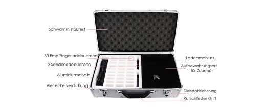 Ta obudowa może ładować 2 nadajniki T130 i 30 odbiorników T131 jednocześnie, dzięki czemu bezprzewodowe systemy przewodników turystycznych są łatwe do przenoszenia, ładowania i przechowywania.