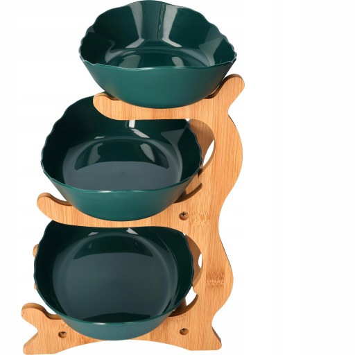 Piętrowa patera wykonana z drewna bambusowego i eleganckich misek w odcieniach morskiej zieleni dodaje elegancji i stylu do każdej aranżacji stołu. Bambusowa konstrukcja wprowadza naturalny, ciepły akcent do wnętrza, podczas gdy eleganckie miski dodają świeżości i nowoczesności.