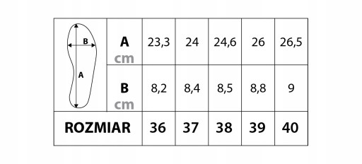 PONIŻEJ- TABELA ROZMIARÓW DAMSKICH- DLA NAJLEPSZEGO DOPASOWANIA ROZMIARU BUTA: