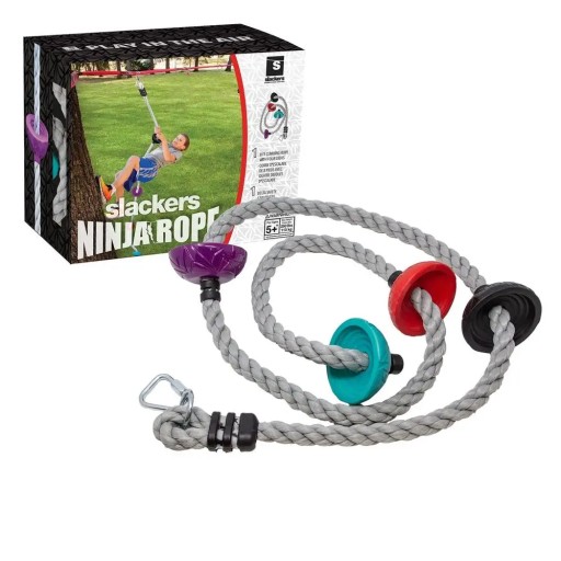 Lina wspinaczkowa SLACKERS Ninja Rope to odporna na warunki atmosferyczne lina o długości 2,5 mi grubości 3 cm, która posiada 4 okrągłe stopnie w odległości 45 cm od siebie. Linę można łatwo przymocować do Ninjaline, bujanych ram, domków na drzewie lub gałęzi za pomocą metalowego karabińczyka dołączonego do opakowania.