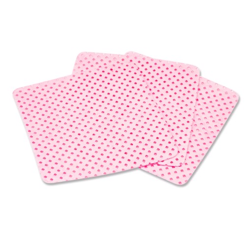 Waciki bezpyłowe perforowane w kolorze różowym, skutecznie usuwają lepkie materiały z powierzchni paznokci, skóry i trudno dostępnych miejsc.