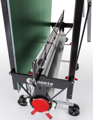 Stół do tenisa stołowego SPONETA S3-46e jest to stół zrobiony z wysokiej jakości materiałów, którego powierzchnia porównywalna jest do stołów wykorzystywanych w turniejach światowych. Posiada opcje rozkładania się w 2 oddzielne połówki które umożliwiają grę jednoosobową. Montaż i demontaż może łatwo przeprowadzić dziecko i dzięki podwójnym bezpiecznikom gwarantuje pewne i bezpieczne składanie. Praktyczny system jezdny, posiada cztery koła gumowe. Idealny do szkół, klubów oraz ośrodków wypoczynkowych. Stół do tenisa stołowego jest przeznaczony do stosowania we zewnątrz.