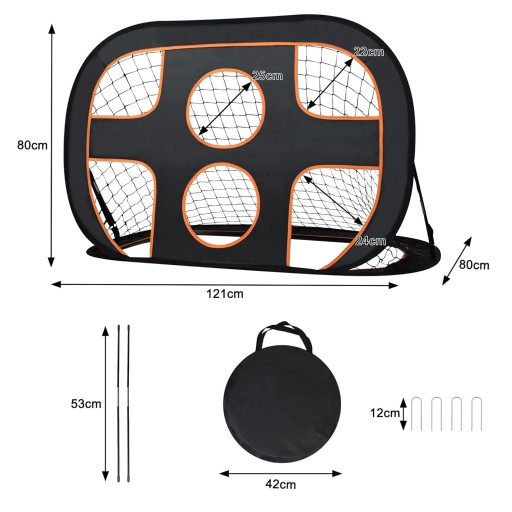 ⚽ - Dwukierunkowa konstrukcja z sześcioma obszarami docelowymi po jednej stronie, co może pomóc poprawić dokładność celu i umiejętności strzeleckie, po drugiej stronie znajduje się klasyczna bramka piłkarska.