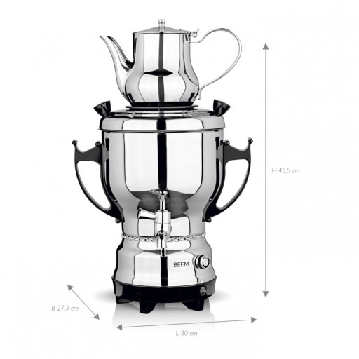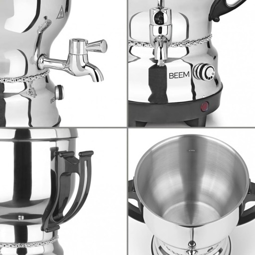 Moc 2200 W, płynna regulacja termostatu i inne komfortowe funkcje samowaru BEEM TEA-CLASSIC bez wątpienia zapewniają błyskawiczne przygotowanie herbaty i optymalny rozwój aromatu. Oprócz dużej mocy elektryczny samowar do herbaty posiada również wysokiej jakości obudowę ze stali nierdzewnej. Dzięki zintegrowanemu pokrętłu woda może być utrzymywana w żądanej temperaturze.