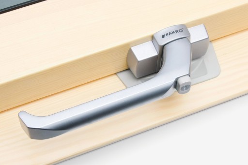 Klamka z blokadą ZBH w kolorze srebrnym, z powłoką satynową zabezpiecza przed niepożądanym otwarciem okna. Montowana jest w dolnej części okna FAKRO w miejsce wcześniej standardowo zamontowanej klamki.