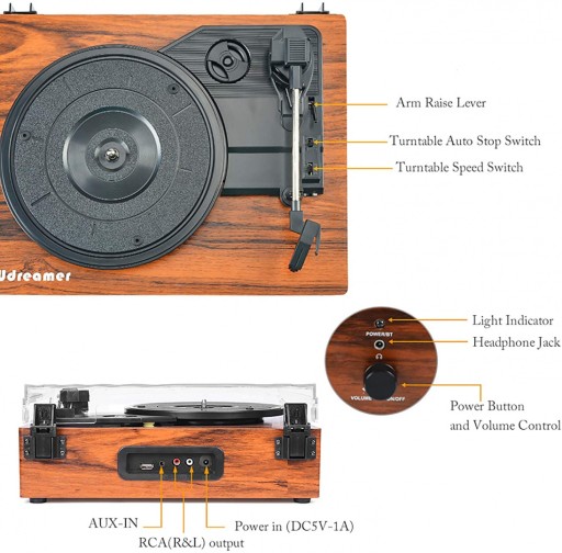 - Wykonane z drewna w stylu vintage w połączeniu z nowoczesną technologią modową, pozwala cieszyć się muzyką w stylu retro z płyt winylowych lub muzyką cyfrową dzięki technologii bezprzewodowej. Zdejmowana osłona przeciwpyłowa sprawia, że gramofon jest czysty i nowy