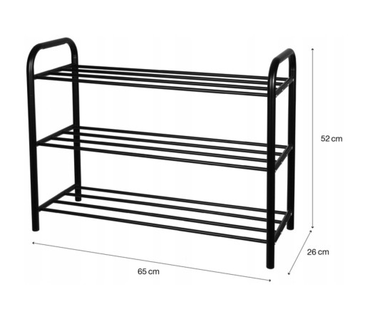 Praktyczna 3-poziomowa metalowa półka przeznaczona jest do przechowywania obuwia. Odpowiednia szerokość i wysokość półek gwarantuje, że możesz na nich przechowywać wszystkie rodzaje butów. Na regale pomieścisz około 8-12 par butów.