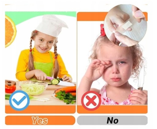 - Ochrona palców: Kid Safe Kitchen Tool posiada delikatne krawędzie, dzięki czemu dziecko nie zostanie zranione podczas użytkowania. Antypoślizgowy uchwyt poprawia dokładność cięcia. Może zapewnić bezpieczeństwo dzieciom, które jeszcze nigdy nie pracowały z nożami.