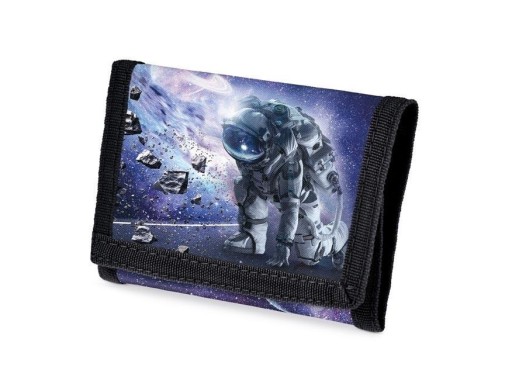 Portfel dla dziecka z kolorowym nadrukiem. Posiada przegródkę na banknoty, monety, kieszonkę np. na bilety oraz przezroczystą kieszonkę wielkości karty do bankomatu.