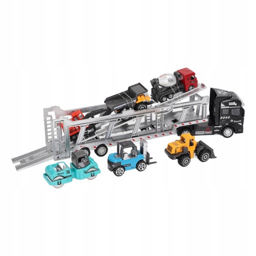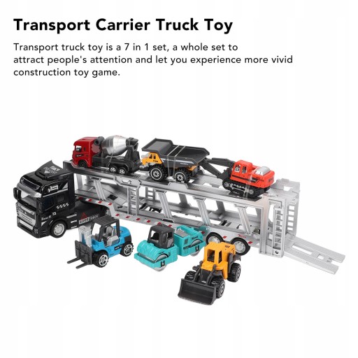 Funkcja:1. 7 sztuk: zabawkowa ciężarówka transportowa to zestaw 7 w 1, cały zestaw, aby przyciągnąć uwagę ludzi i pozwolić ci doświadczyć bardziej żywej gry budowlanej.