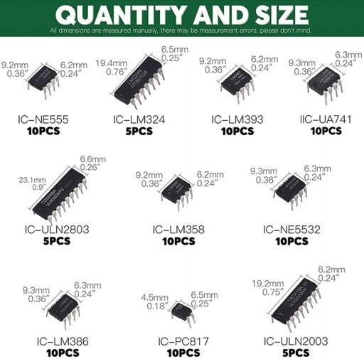1. 10 specyfikacji: ten zestaw zawiera 10 specyfikacji układów scalonych, którymi są NE555, LM324, LM393, UA741, ULN2803, LM358, LM386, NE5532, ULN2003, PC817.