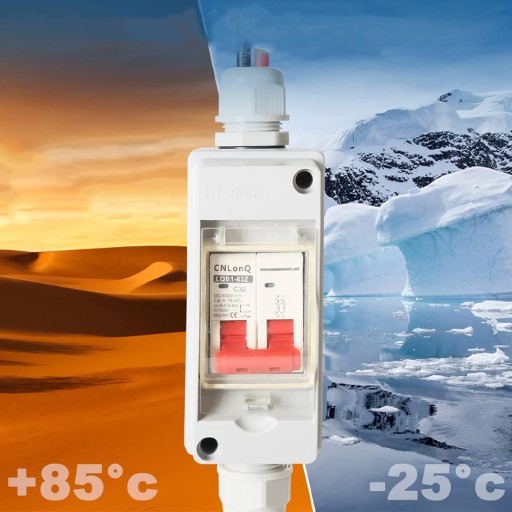 - Wodoodporna i pyłoszczelna obudowa IP65 zapewnia doskonałą odporność na warunki atmosferyczne i promieniowanie UV, chroniąc wyłącznik DC PV przed trudnymi warunkami, takimi jak wiatr i deszcz, palące słońce i ekstremalne wahania temperatury.