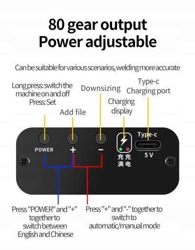 10. Po uruchomieniu maszyny moc wyjściową zgrzewarki punktowej można zmienić krótkim naciśnięciem przycisku, a niebieskie światło wskazuje położenie biegu