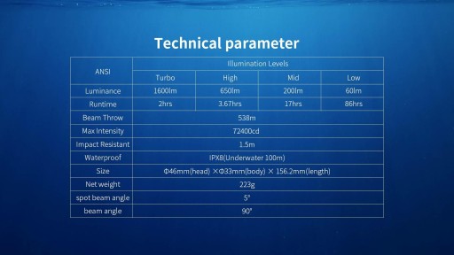 Profesjonalna latarka do nurkowania XTAR D26 1600S to nowa wersja latarki D26, stworzona specjalnie by ułatwić podwodną komunikację oraz bezpieczną eksplorację jaskiń w przejrzystej wodzie. Latarka ma skoncentrowaną do 5 stopni wiązkę światła, która bez problemu penetruje ciemności w eksplorowanych przestrzeniach. Generuje także rozproszone boczne światło doświetlające o kącie 90°. A odpowiednio dobrany odbłyśnik daje przyjemną i miękką poświatę. Pozwala to zobaczyć większe obiekty, dobrze oświetlone i wyraźne. Praktyczny profesjonalizm lampa pokazuje w wodach o małej przejrzystości. Wąski kąt i skupienie głównej wiązki działa tu idealnie. Promień latarki widoczny jest wyraźnie, nawet z większych odległości i zapewnia skuteczną komunikację.