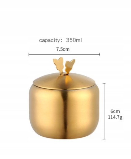Trwała i elegancka. Można myć w zmywarce.stan: 100% nowymateriał: stal nierdzewnaprzeznaczenie: cukier, zioła, przyprawy itd.zestaw zawiera: 1 pojemnik 1 łyżeczkawymiary: 7,5cm x 6cm