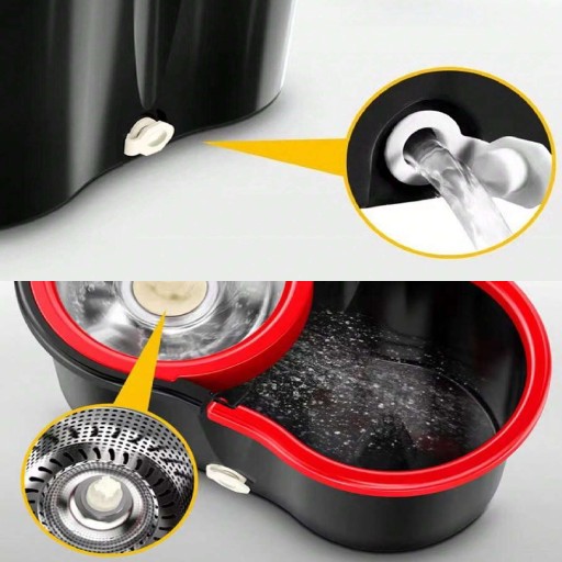 Wiadro mopa jest pojemne (14 litrów), co umożliwia efektywne mycie dużych powierzchni bez konieczności częstego zmieniania wody. Wiadro posiada także wbudowany metalowy wirnik, który umożliwia szybkie wypłukanie i wyciśnięcie mopa. Zatyczka na dole wiadra pozwala na łatwe wylanie wody po zakończeniu sprzątania. Kompaktowy rozmiar i wygodna rączka ułatwiają przenoszenie i przechowywanie wiadra.