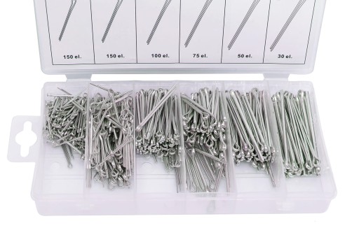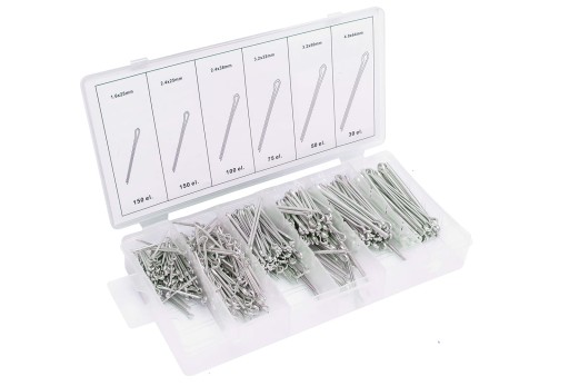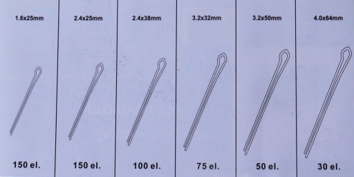 Zestaw zawiera zawleczki o różnych rozmiarach, co pozwala na dopasowanie do różnych zastosowań.