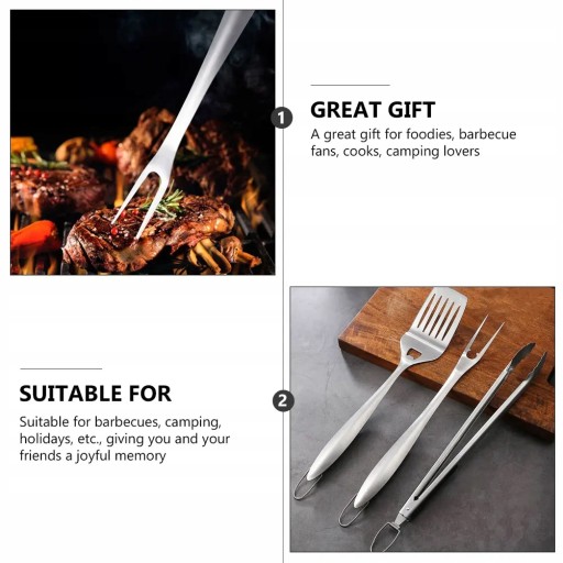 Jest to zestaw narzędzi do grillowania na świeżym powietrzu, zawiera zacisk, widelec i szpatułkę, które są wykonane z wysokiej jakości materiału ze stali nierdzewnej, co zapewnia trwałe i praktyczne zastosowanie. Świetne narzędzie do grillowania na świeżym powietrzu dla przyjaciół, rodziny i współpracowników podczas parapetówki.