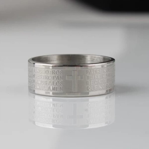 PIERŚCIEŃ W MOTYWIE KRZYŻA Z HISZPAŃSKIM GRAWEREM MODLITWY OJCZE NASZ.