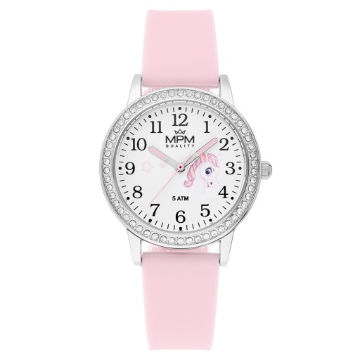 Stylowy dziecięcy zegarek MPM dla dziewczynek z motywem kucyka i trzema gwiazdkami. Zegarek wyposażony jest w srebrne ołówkowe wskazówki z kolorową imitacją warstwy luminescencyjnej oraz cienką kolorową wskazówkę sekundową. Tarczę zegarka zdobi motyw kucyka z trzema gwiazdkami w kolorystyce kompatybilnej z paskiem. Ozdobne obramowanie koperty zegarka wysadzane jest 54 cyrkoniami, co nadaje jej elegancki wygląd.
