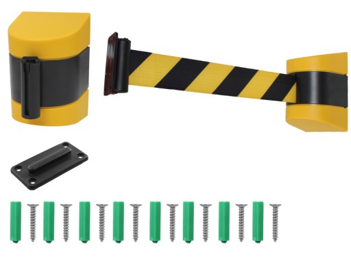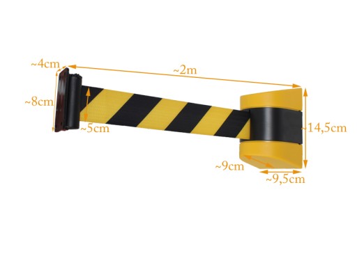 Kaseta z wyciąganą taśmą samozwijającą w kolorze żółto-czarnym o długości 2 m pozwala w łatwy sposób zagrodzić oraz wygrodzić odpowiednie ciągi komunikacyjne tak by ruch odbywał się w sposób uporządkowany lub w widoczny sposób wygrodzić miejsca do których dostęp jest ograniczony. Dzięki regulowanej długości taśmy możliwe jest proste dostosowanie długości do szerokości przejścia czy pomieszczenia lub obiektu, które chcemy wygrodzić. Jest to doskonałe rozwiązanie do hoteli, restauracji, urzędów czy podczas wydarzeń kulturalnych i targów.