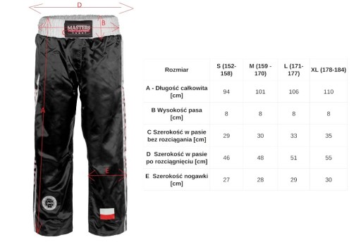 Długie spodnie do kickboxingu. Doskonale sprawdzą się podczas najważniejszych zawodów czy treningów. Szeroka guma w wyróżniającym się kolorze i wewnętrzne sznurki utrzymują spodnie we właściwym miejscu. Bardzo duży klin pozwala na większą swobodę ruchu i wygodę przy noszeniu suspensora. Na jednej nogawce nadruk z polską flagą, a na drugiej logo WAKO - posiadają atest do startu w zawodach kickboxingu.
