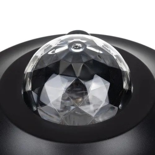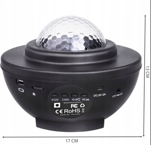 - SPECYFIKACJA - kolor: czarny; timer: tak, 1h,2h lub możliwość całonocnego świecenia; materiał: tworzywo sztuczne / metal; zasilanie: sieciowe; zasilanie pilota: baterie 2xAAA (brak w zestawie); 3 poziomy jasności; odtwarzacz muzyki: poprzez Bluetooth lub z Pendrive; kolory: RGB+white; laser imitujący zielone gwiazdki: tak; funkcje świecenia: „fade1”: wolna zmiana kolorów, „fade 2” wolna zmiana dwóch kolorów; „S+” fala (ruchomy wzór) z dowolnym kolorem bądź wszystkimi + laser; „S-” dowolne kolory bądź ich łączenie + znikające gwiazdki; przycisk mikrofon: świeci w tempie muzyki; wymiary (dł/szer/wys): 17/17/13cm; waga: 0,383kg; waga w opakowaniu: 0,556kg