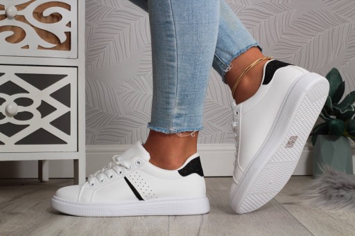 Damskie buty sportowe w kolorze białym z czarnymi elementami na płaskiej podeszwie. ❤ Wykonane z dobrych jakościowo materiałów. Sprawdzą się jako obuwie codzienne oraz sportowe. Sneakersy są lekkie i zapewniają wygodę oraz komfort użytkowania. Podeszwa stabilna, dobrze amortyzuje stopę.🔥 Modny, ponadczasowy fason idealnie dopasuje się do wielu stylizacji! Dobrze prezentuje się na nodze. 💯