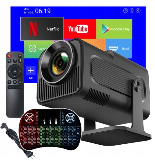 MINI PROJEKTOR RZUTNIK OBROTOWY LED HD ANDROID 11 WIFI USB BT 10000LM NETFLIX, YOUTUBE, PRIME VIDEO, DISNEY+, MAX, VIAPLAY KLAWIATURA