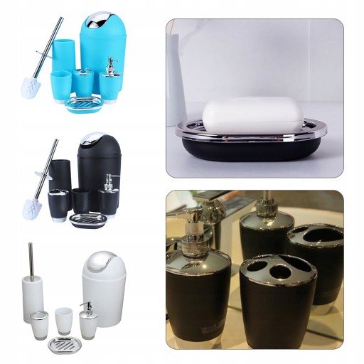Zestaw akcesoriów łazienkowych: Zestaw zawiera 6 akcesoriów łazienkowych, w tym uchwyt na szczoteczkę do zębów, kubek do mycia, pojemnik na mydło, butelkę z płynem do dezynfekcji rąk, kosz na śmieci i szczotkę toaletową z uchwytem do różnych potrzeb.