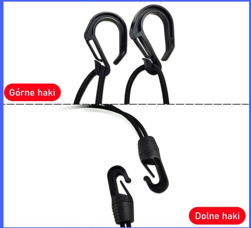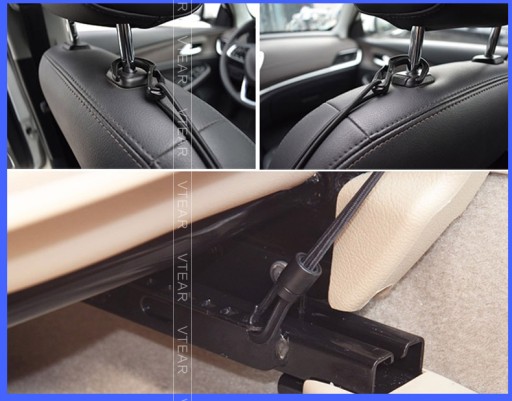 Górne haczyki zapina się o mocowanie zagłówków, a dolne o elementy konstrukcyjne mocowania fotela.