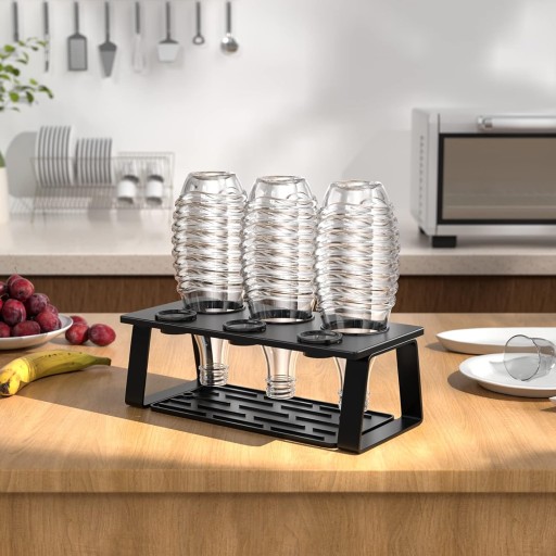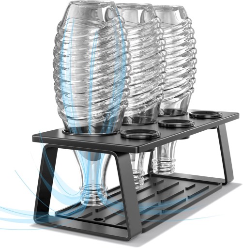 Nasz 3-częściowy uchwyt na butelki do SodaStream wyposażony jest w wyjmowaną tackę ociekową, która chroni powierzchnię blatu podczas suszenia butelek.