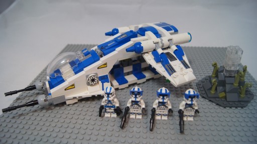 Przedmiotem sprzedaży jest widoczny na zdjęciach zestaw LEGO nawiązujący do tematyki Star Wars. Przedstawia własną wariacje statku typu Dropship, dostosowanego do klonów z 501-go legionu.