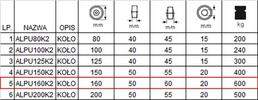 Na tej aukcji sprzedaje koła z bieżnikiem z poliuretanu o podwójnym łożyskowaniu kulkowym o kodzie ALPU160K2 (poz. w tabeli nr 5).