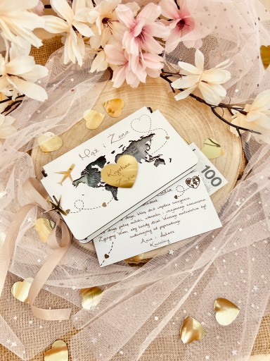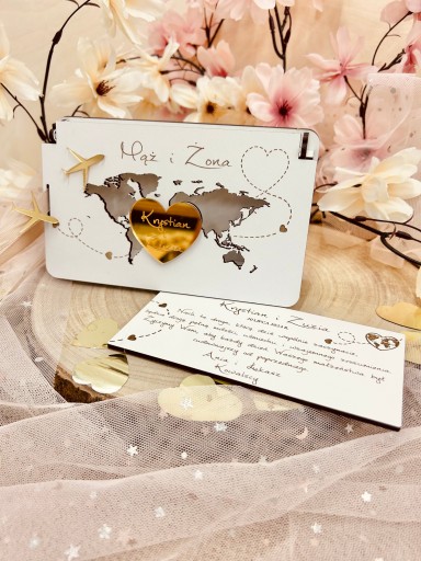 W pudełeczku znajdują się imiona Pary Młodej, data uroczystości, życzenia i podpis, które podlegają personalizacji. Do pudełeczka zmieszczą się banknoty i inne drobne upominki np.zdrapki czy kupony.