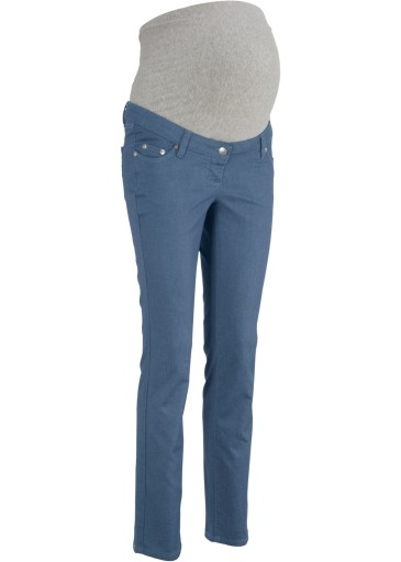 Spodnie ciążowe z elastycznym paskiem na brzuch i wygodnym paskiem w talii z możliwością regulacji, dzięki czemu nadają się do noszenia przez całą ciążę. Fason z 5 wpuszczanymi kieszeniami z przodu i z tyłu.