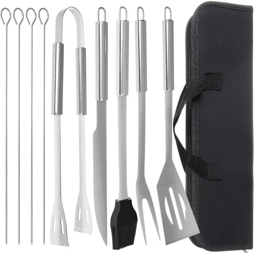 - AŻ 9 ELEMENTÓW W ZESTAWIE – zestaw przyborów do grilla zawiera wszystko, co jest niezbędne do amatorskiego i bardziej profesjonalnego grillowania. Znajdziemy tu ostry nóż, widelec, a także łopatkę, pędzel i szczypce. Oprócz tego w skład zestawu wchodzą również 4 szpikulce – idealne do przygotowania szaszłyków.