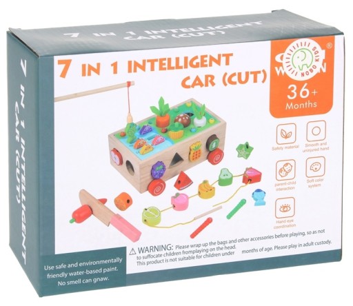Fantastyczna zabawa i nauka w jednym. Drewniane solidne autko z otworami u góry i po boku w różnych kształtach. Głównym zadaniem sortera to dopasowanie klocków do odpowiednich otworów, dzięki kolorowym klockom zapewnia także świetną zabawę. Do zestawu dołączono drewniane warzywka z rzepem i nożem do ich krojenia. Można także łowić rybki i łapać robaczki na wędkę z magnesem. W owocach są wydrążone dziurki, przez które można nawlec, drewnianą igłę ze sznurkiem. Autko pełni również funkcje wózeczka na elementy zestawu, po skończonej zabawie otwieramy górną część autka i chowamy wszystkie elementy do środka. Ta wielofunkcyjna zabawka sprawi wiele frajdy niejednemu dziecku podczas zabawy. Dodatkowo możesz mieć pewność, że zabawa nie będzie miała końca oraz sprawi wiele przyjemności dziecku.