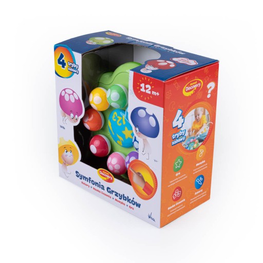 Symfonia Grzybków Ćwicz liczenie i nazywanie barw razem z kwiatkiem, pełnym soczyście kolorowych grzybków! Kwiatek na kołyszącej podstawie zabawi na 4 różne sposoby! Zabawka posiada 4 tryby działania: cyfry, muzyka, kolory i gry. Aby wybrać konkretny tryb, należy nacisnąć na niebieskie kółko, znajdujące się na środku zabawki. W trybie cyfry, zadaniem malucha będzie liczenie kropek, znajdujących się na kolorowych grzybkach, w trybie kolory, poznawanie nazw kolorów widocznych na grzybkowych kapeluszach, w trybie muzyka, grzybki w magiczny sposób przekształcą się w klawisze pianinka, aby maluch mógł zagrać na nich prawdziwy koncert, a w trybie gra, zabawka będzie zadawać pytania dotyczące liczenia i określania kolorów. Zabawka wyposażona jest w regulację głośności oraz wyłącznik. Cechy zabawki: - zabawka mówi po polsku; - 4 tryby zabawy: nauka kolorów, nauka liczenia, muzyka, gra; - regulacja głośności; - podświetlane przyciski; - kołysząca się podstawa; Wiek: 12m+