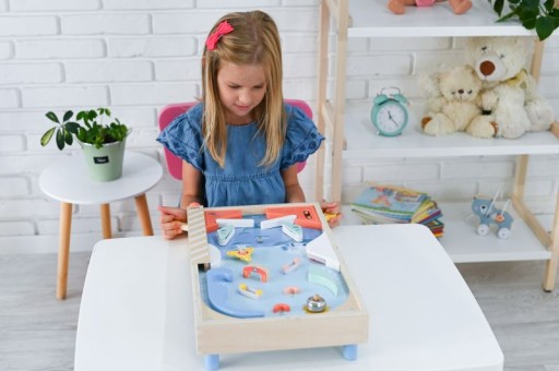 Zabawka polegająca na utrzymywaniu metalowej piłki na drewnianej planszy z przeszkodami. Aby rozpocząć zabawę należy pociągnąć drewnianą gałkę, by wystrzelić piłkę, a potem spróbować jak najdłużej utrzymać ją w grze za pomocą bocznych przycisków. Produkt pozwoli rozwijać zręczność, koordynację ruchowo-wzrokową oraz koncentrację. Zabawka jest przeznaczona dla dzieci od 3 roku życia i doskonale sprawdzi się jako prezent świąteczny lub urodzinowy.